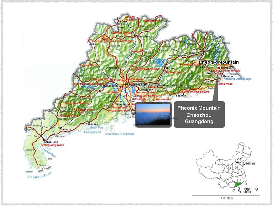 The Chaozhou Phoenix Mountain, among the 73 Phoenix Mountains, is known for its tea. It has beautiful scenery, fresh air, and a mild,humid climate, with an annual average temperature of about 20℃ and average annual