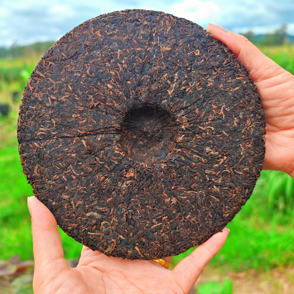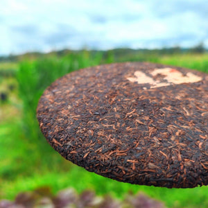 fermentation, and is aged for several years. The dry tea's black and golden texture is revealed, and the soup color is red, thick and translucent. Its aroma is pure,dominated by old aroma and woody sweetness. The taste is mellow and smooth, with obvious sweetness and almost no bitterness. It is warm and comfortable after drinking. This tea is mild in nature and should be tasted and stored. It fully displays the mellow and original flavor of ripe Pu Pu at 30 degrees north latitude.